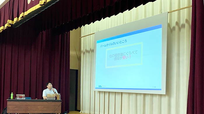 弊社は、アブラヤシの実からできるパームオイルについて授業を実施しました。RSPO認証マークをはじめ、環境に配慮した認証マークの紹介を通じて、消費者である私たちが商品選びの基準として新たな気づきを得られるよう解説しました。